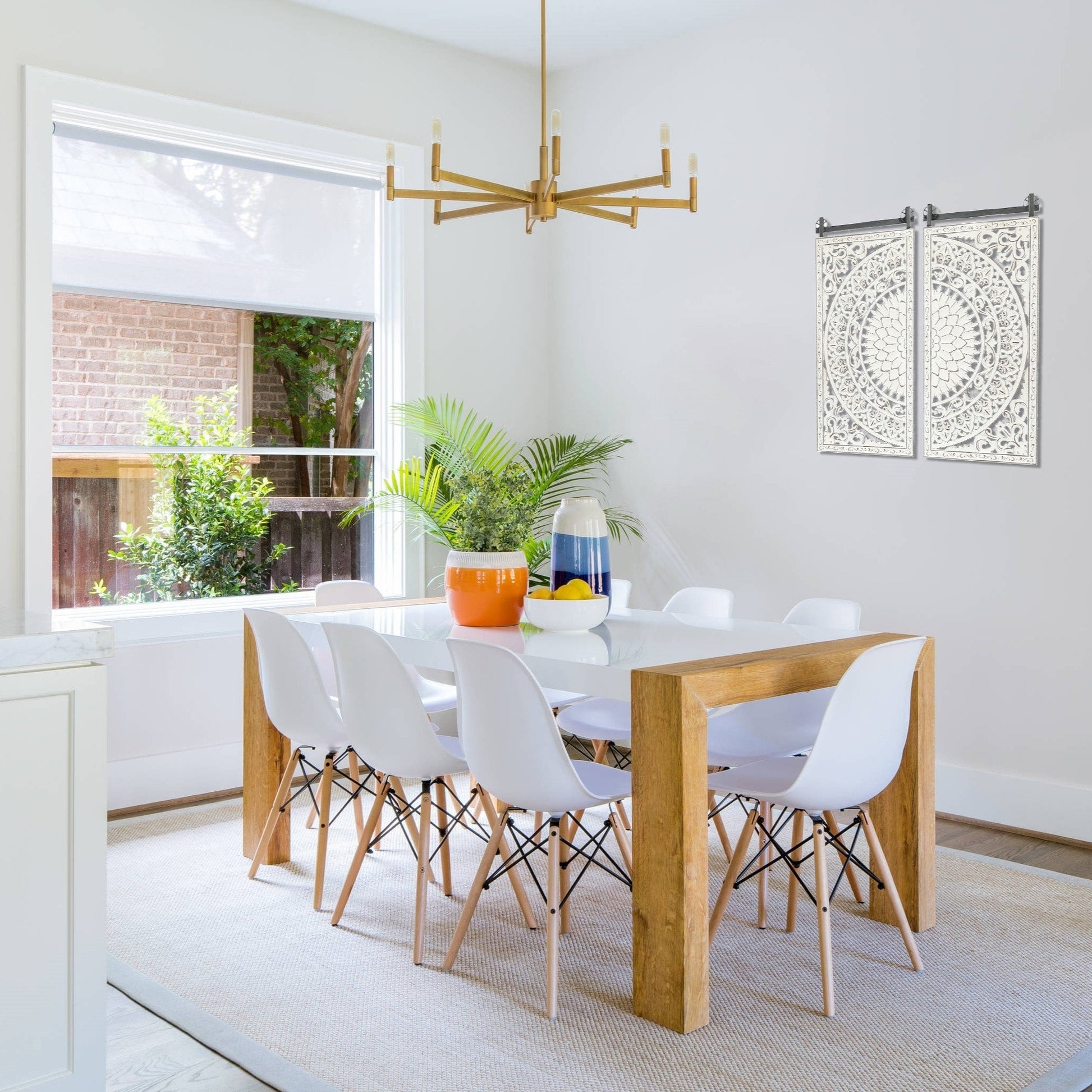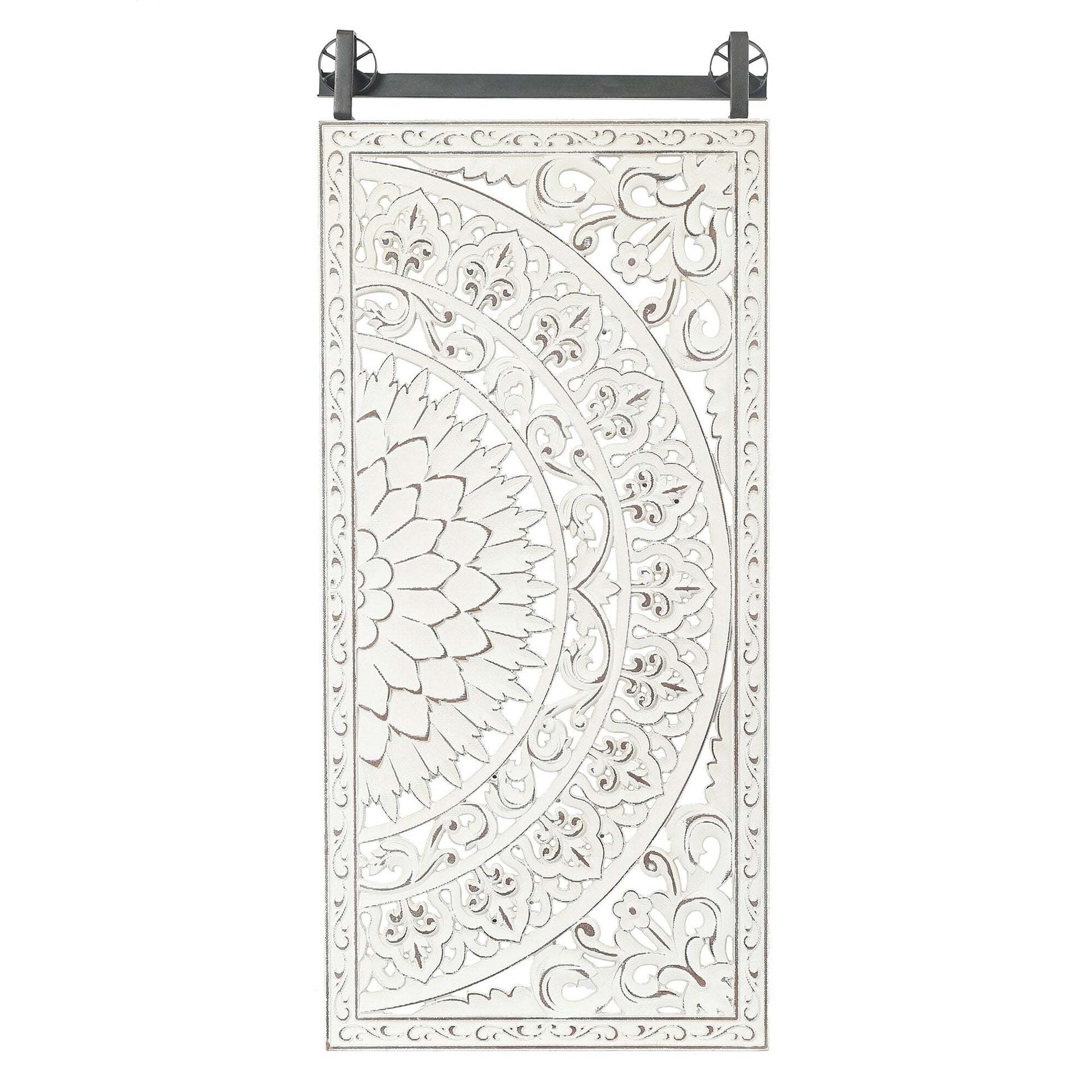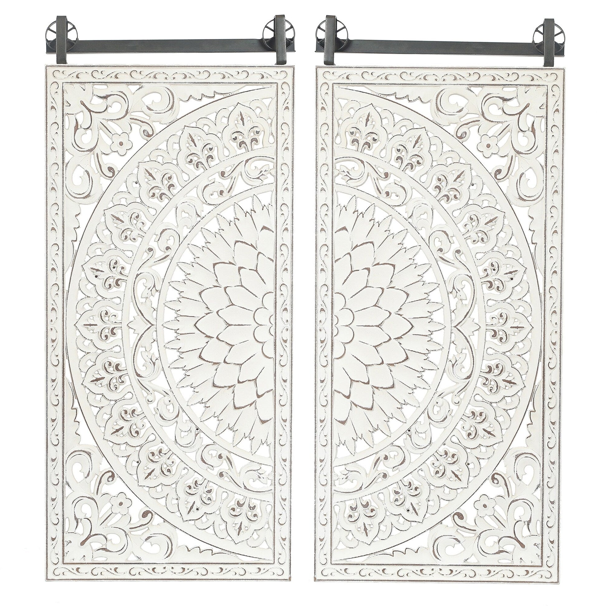 Envie d'ajouter une touche de fraîcheur, de charme et de romantisme à votre décoration intérieure ? Ne cherchez plus : ce magnifique ensemble de deux pièces de décoration murale à motifs floraux sculptés à la main est fait pour vous. Chaque pièce est fabriquée avec soin en bois manufacturé de haute qualité, avec un magnifique motif floral sculpté et des détails en relief d'un blanc ivoire doux rehaussé de touches de brun pour plus de profondeur et un charme vintage. Les panneaux sont fixés à une solide barre en fer noir patiné, conférant à l'ensemble un style campagnard moderne. Facile à fixer grâce à deux anneaux en D métalliques, cette magnifique décoration murale attirera tous les regards et s'harmonisera avec tout type de décoration intérieure. Ne vous contentez pas d'un mur vide et ennuyeux : donnez-lui l'éclat qu'il mérite avec cette magnifique décoration murale florale.