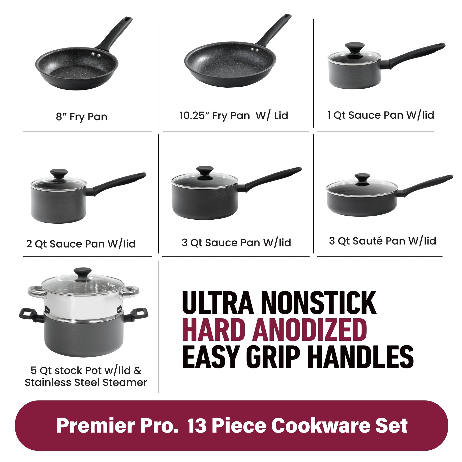 - Ensemble complet de 13 pièces : comprend une poêle de 8 po, une poêle à frire de 10,25 po avec couvercle, des casseroles de 1,5 pinte, 2 pintes et 3 pintes avec couvercles, une sauteuse de 3 pintes avec couvercle, une marmite de 5 pintes avec couvercle et un panier vapeur en acier inoxydable pour une solution de cuisine complète.