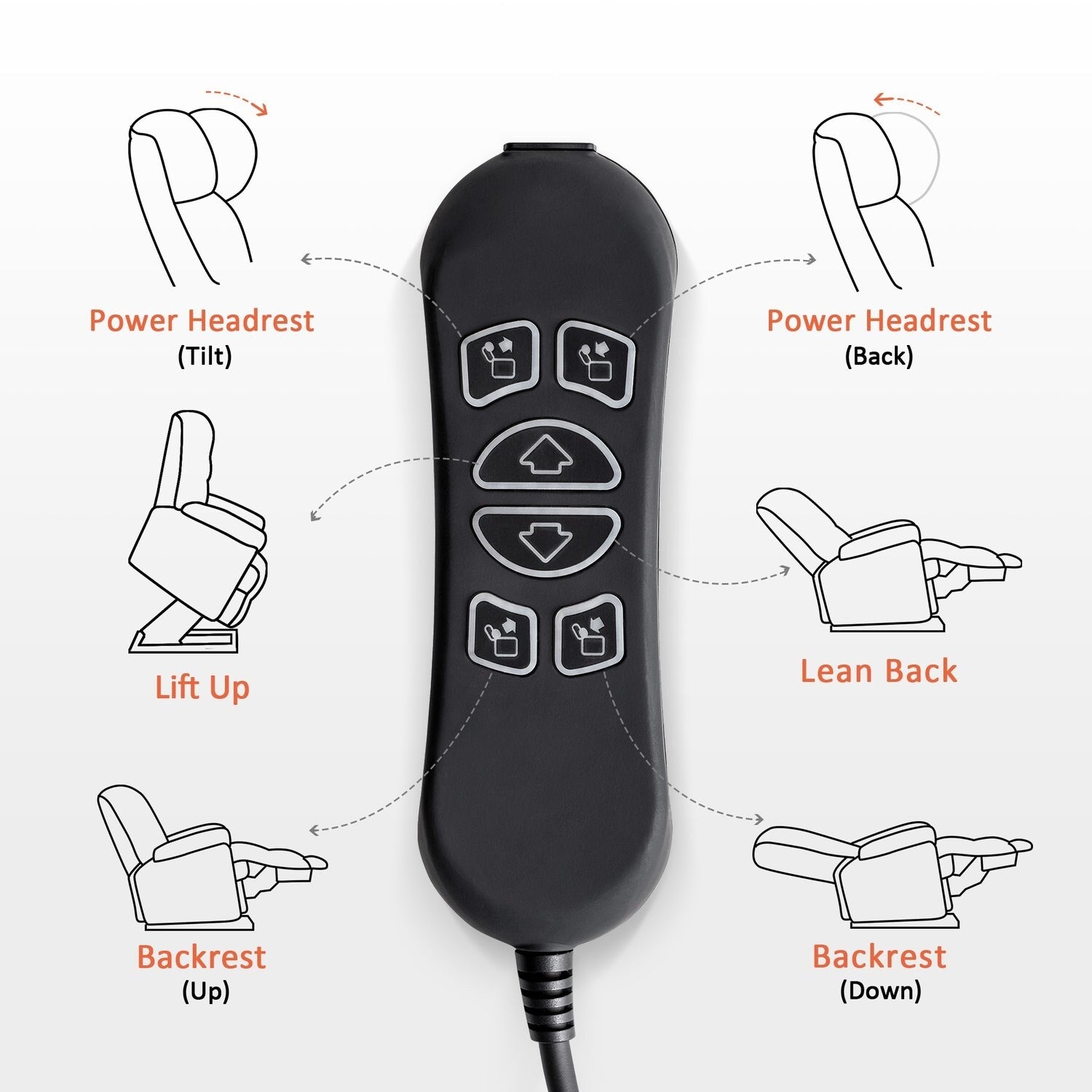 - Appuie-tête électrique : Bien que les appuis-tête réglables puissent être utilisés pour un confort personnalisé en position assise droite, ils sont spécialement conçus pour permettre à une personne inclinée en arrière de regarder vers l'avant, par exemple vers la télévision, sans forcer la tête ou le cou