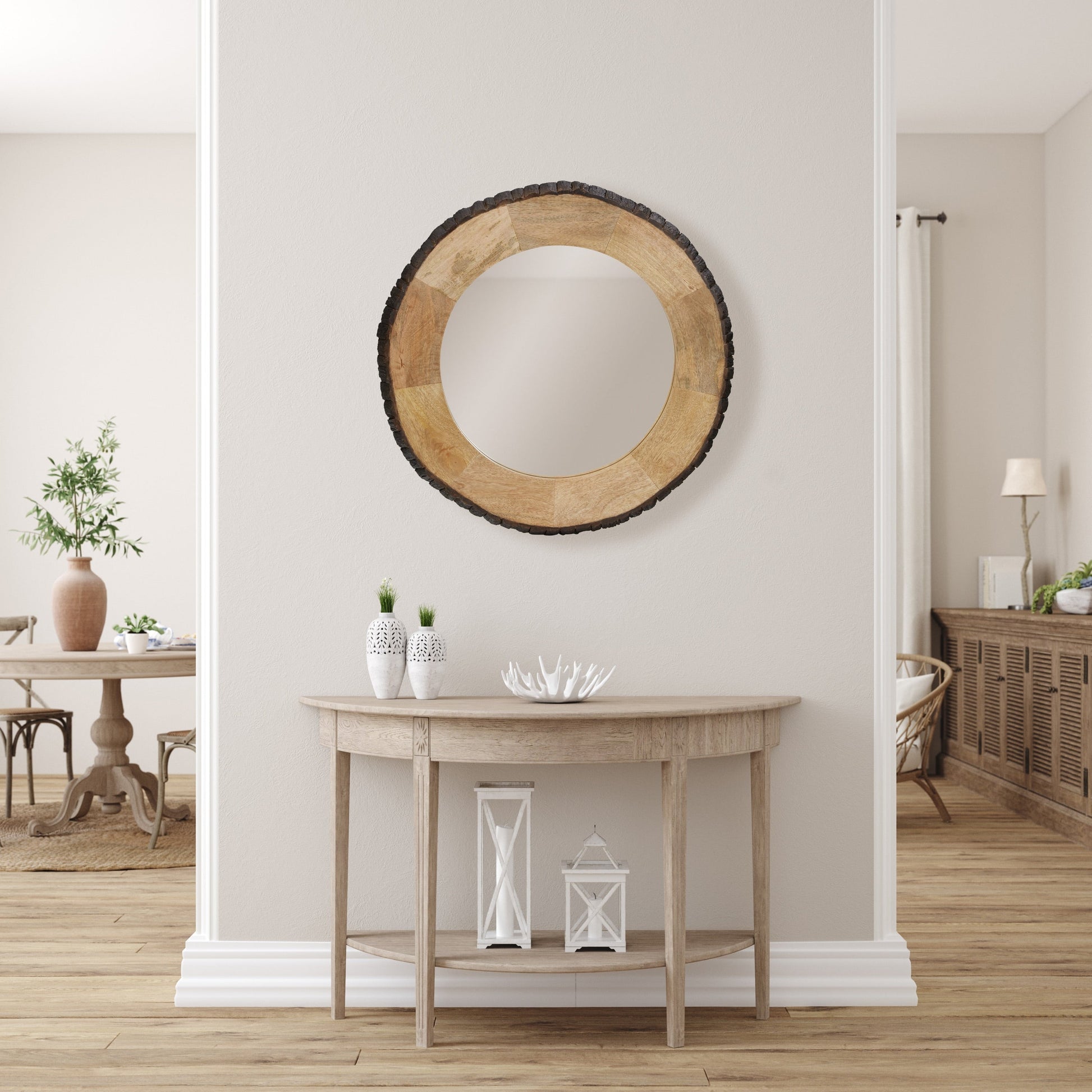 - Miroir mural rond en bois de manguier massif et verre