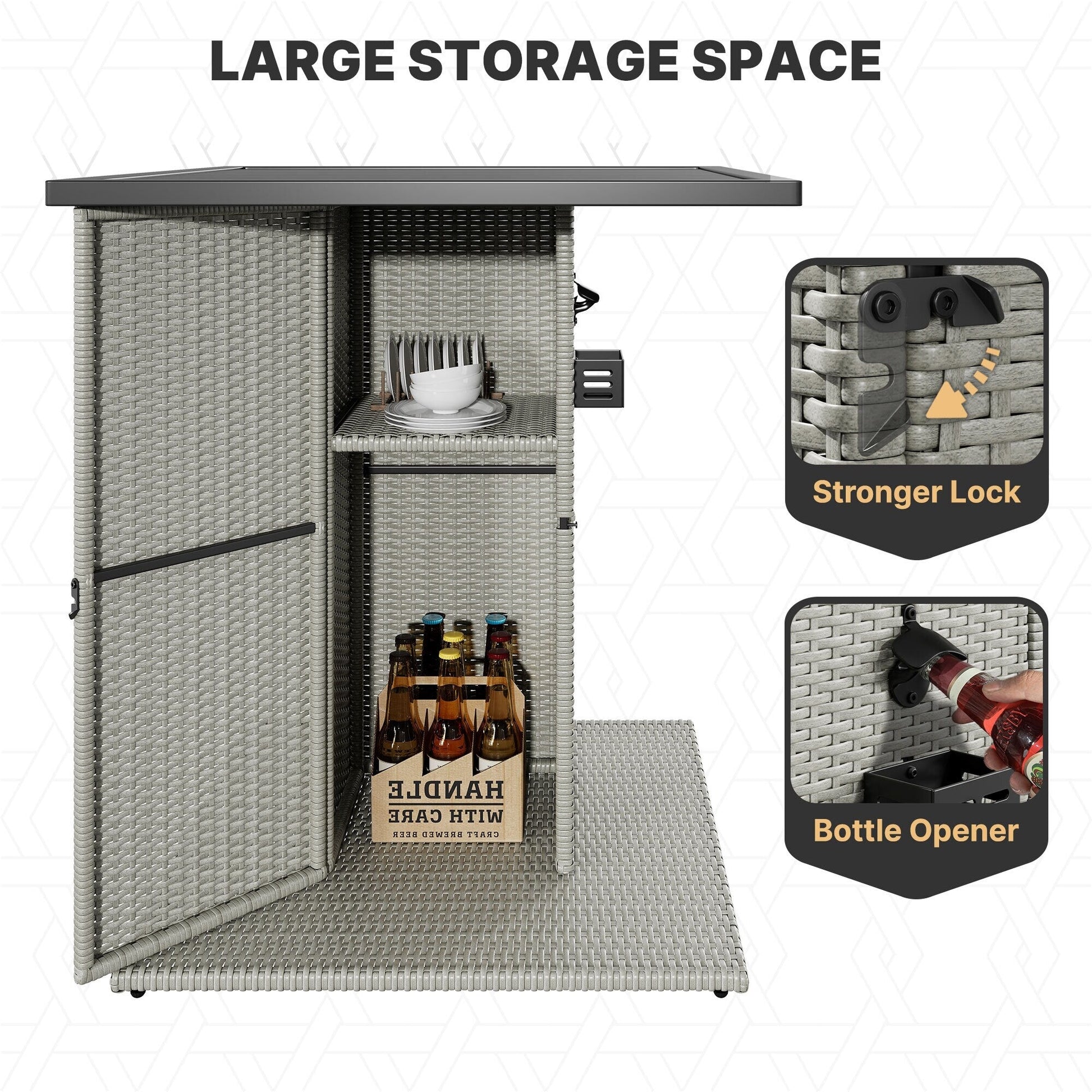 La table de bar est dotée d'un décapsuleur et d'un compartiment de rangement derrière une porte magnétique pour plus de commodité. Idéal pour divertir vos invités lors de réunions informelles, de dîners ou de fêtes au bord de la piscine.