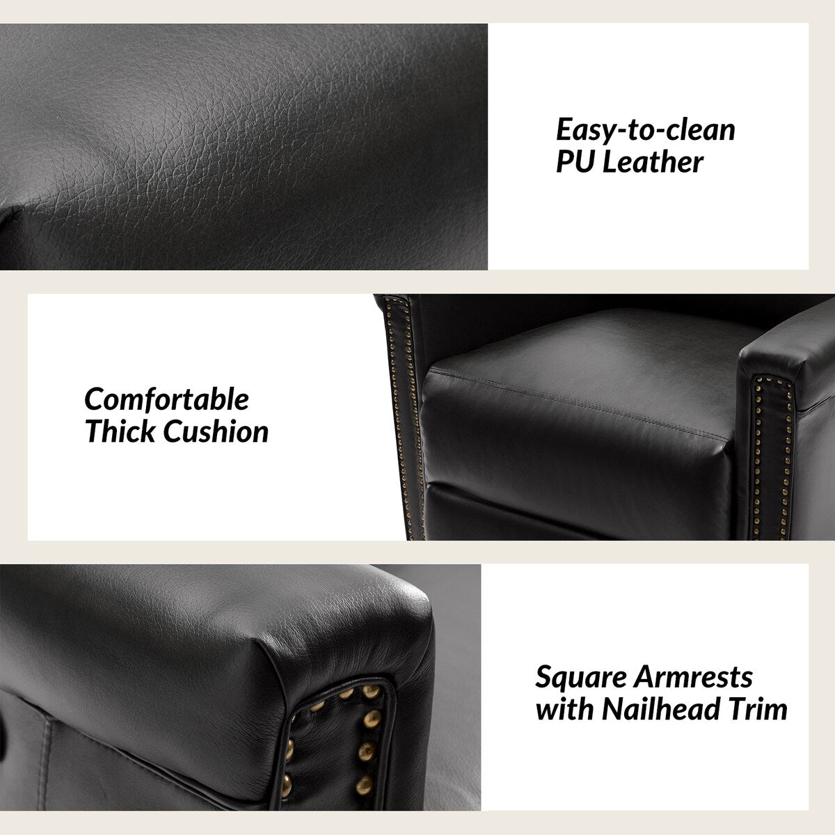 - Garniture de clous en cuivre : ornant les bords du cadre de l'ensemble de fauteuils inclinables, la garniture de clous en cuivre ajoute une touche de sophistication et de raffinement, accentuant le charme traditionnel de l'ensemble de fauteuils inclinables et conférant une esthétique luxueuse à la conception globale.